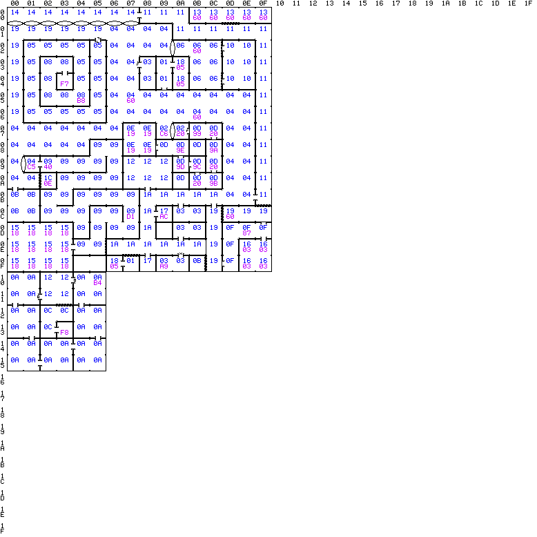 00. You are toast! LEV 3 01. You are by a stairway leading up. 02. You are standing before the Gauntlet. 03. You are in a narrow room. 04. You are in a wide corridor. 05. You are in a twisting corridor. 06. You are in a bleak room. 07. You are in an open area. 08. You are in a snaking hallway. 09. You are in a filthy tunnel. 0a. You are in the room of confusion. 0b. You are in a square room. 0c. You are in a faintly glowing room. 0d. You are inside the Gauntlet. 0e. You are at Death's Door. 0f. You are in a damp hallway. 10. You are inside an abandoned hideaway. 11. You are in a long hall. 12. You are in a room. 13. You are in a seemingly pointless hall. 14. You are at the Walk of Arches. 15. You are at the Great Dragon's lair. 16. You are at a sparkling fountain. 17. You are in a small room. 18. You are at a stairway leading up. 19. You are in a passage. 1a. You are in a hallway. 1b. You are in the haven. 1c. You are facing a fearsome gargoyle. Zone 00: 02,06-07,01 Zone 01: 01,07-0d,0b Zone 02: 0b,02-08,0b Zone 03: 0b,0a-02,08 Zone 04: 0a,09-09,02 Zone 05: 08,07-09,05 Zone 06: 03,09-03,0a Zone 07: 02,03-09,07 Zone 08: 0b,03-03,0b Zone 09: 08,0e-02,03 Zone 0a: 0e,06-0f,04 Special Square Codes: 00-1F=Module (shoppe etc.) 20-7F=Effect/Dangerous 80-9F=Encounter 0-31 A0-BF=Treasure 0-31 C0-DF=Message 0-31 E0-FF=Teleport 0-31